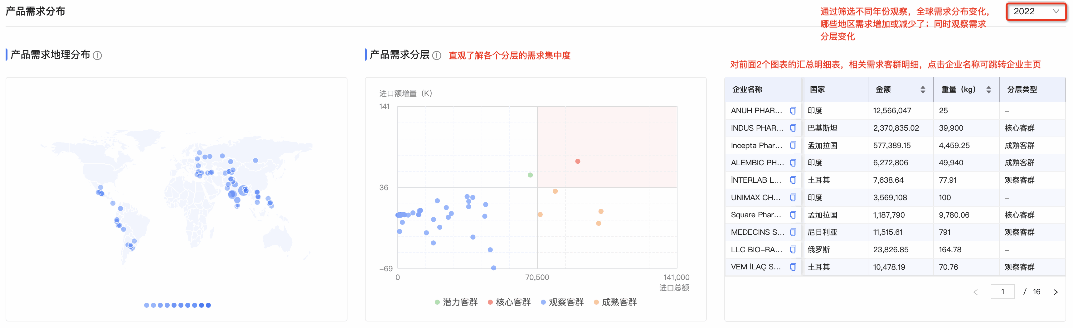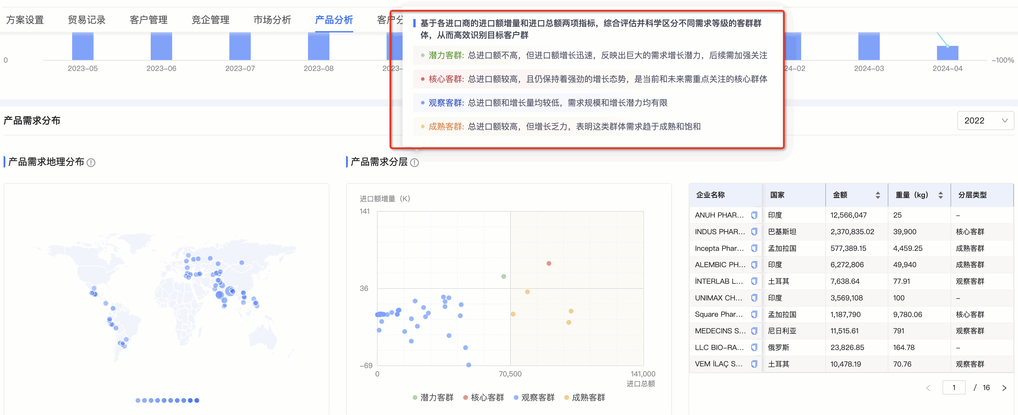 ● 产品需求分层图:royal皇家88(集团) 数据通将需求客群按照进口额增量和总额进行分层,划分为潜力、观察、成熟和核心四个层级。分层有助于用户快速锁定目标客户群体。标题旁附需求分层的解读,能让用户更直观、快速理解每个层级的特征,能够更快速的识别目标客群。